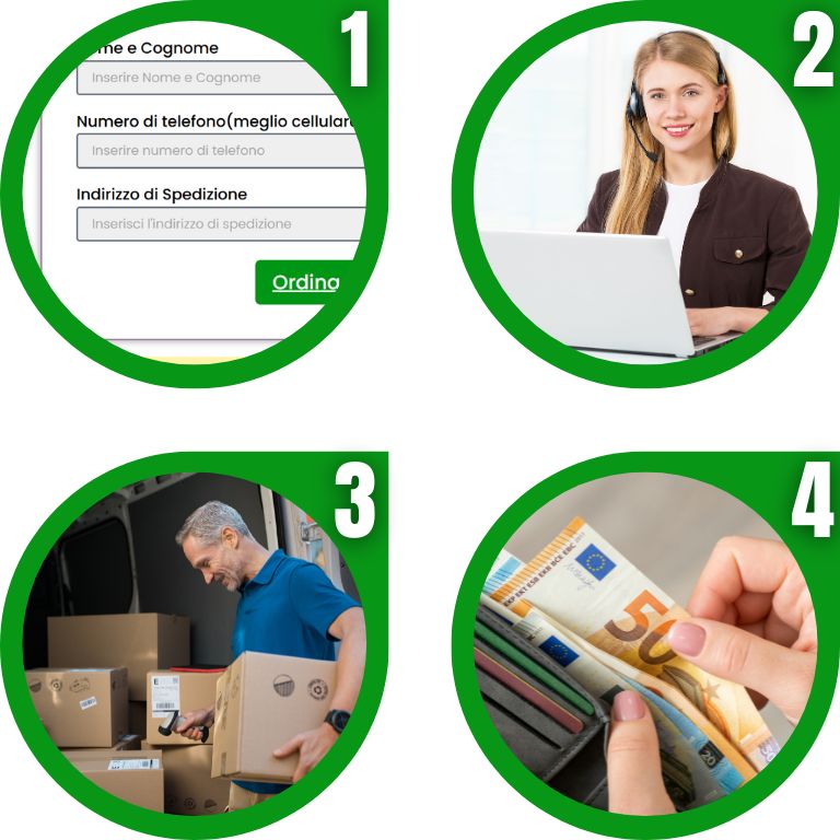 Compila il modulo d’ordine con i tuoi dati, attendi la chiamata del nostro operatore e paga in modo sicuro quando riceverai la merce.